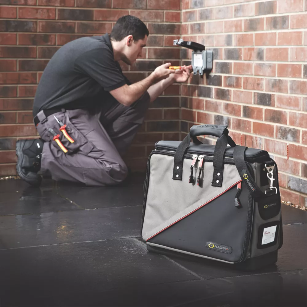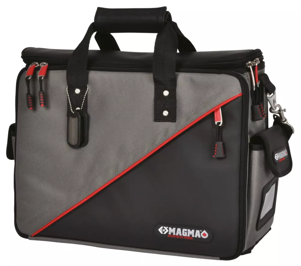 Tool case with fold-out panels, internal document pockets and padded laptop compartment.