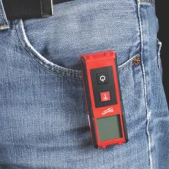 Laser distance measurer with one-person point and shoot system. A backlit backlit screen offers maximum visibility in low light conditions with both metric and imperial units of measurement. Features memory storage, belt clip and auto shut-off. IP54 rated.