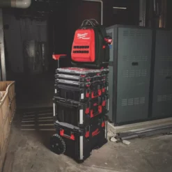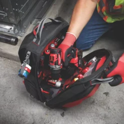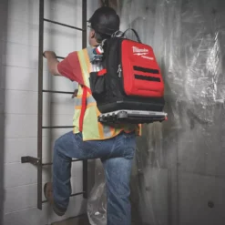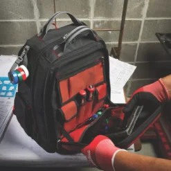 Backpack made from 1680 ballistic material for durability. Hard shell-protected instrument pocket as well as impact-resistant polymer base protects the contents from water and dirt as well as allowing the backpack to stand up. Features 48 pockets, extra back padding, chest strap, attachment strap for rolling bags and heavy duty harness for jobsite comfort. Compatible with the Packout modular storage system.