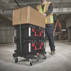 Flat trolley for the PACKOUT modular storage system. Can take up to 113kg of weight capacity, with space to feed straps through for securing objects down. Features durable castors to easily roll with heavy load on a jobsite.