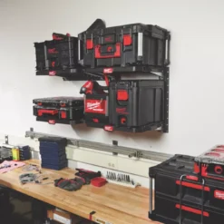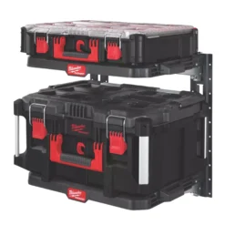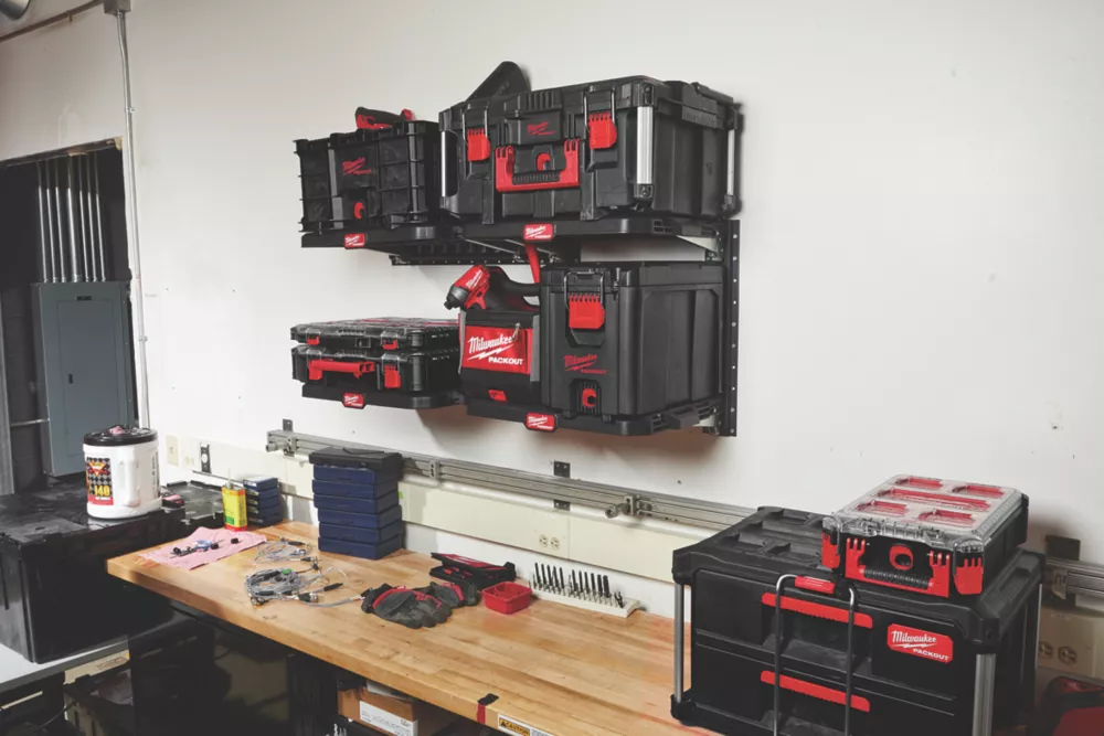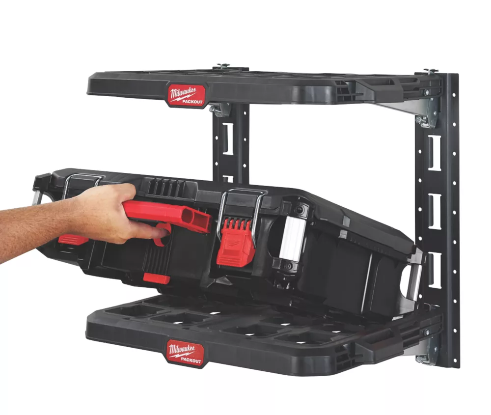 Provides versatile mounting options for the PACKOUT modular storage system. Quick-release design for easy mounting, height adjustment and removal of the shelves. Attaches to E-Track mounting rails, allowing placement in locations such as vans, trucks, trailers, garages and shops. Constructed from impact-resistant polymer with metal-reinforced frame.