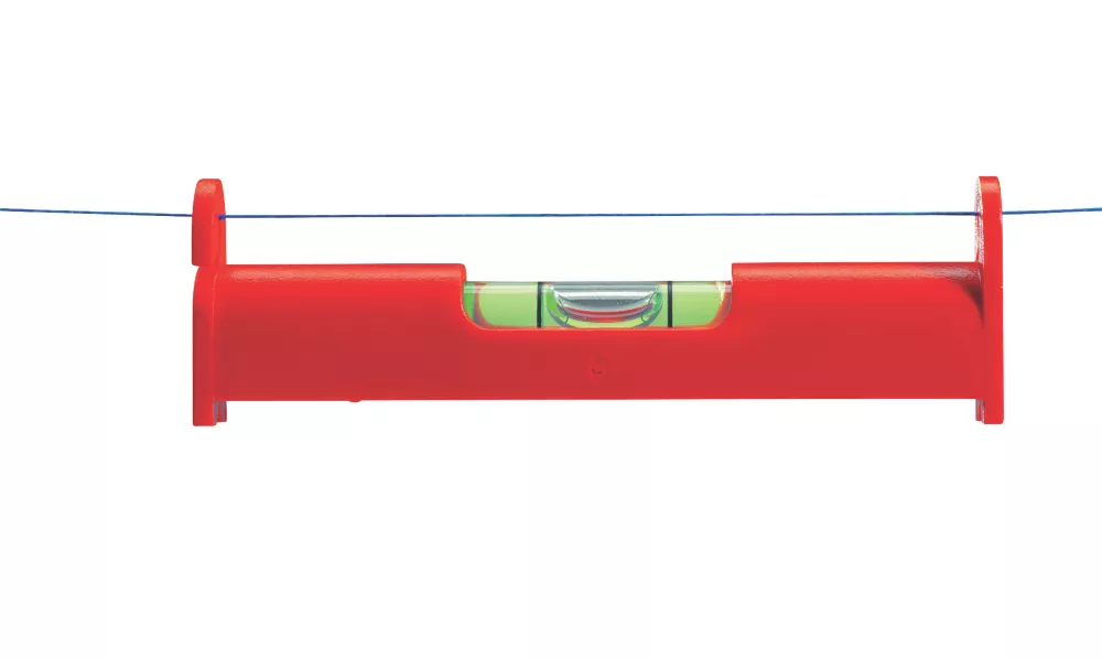 Plastic line level designed for hanging on tensioned lines in order to check the horizontal position of the line.