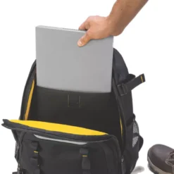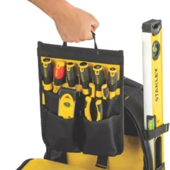 Heavy duty 600 Denier fabric for long lasting durability and weather resistance. 2 padded shoulder straps and a padded back for a weightless feel. Removable inner compartment to hold tools securely and tidy. Design allows full handsfree access. Rigid waterproof plastic base protects against dirt and moisture. Dual-zip opening for access to all contents.