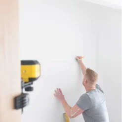 Green beam cross line laser level for DIY and light residential construction jobs. Projects 100° vertical line and horizontal lines. Supplied with locking pendulum, 3-position lock switch and removable quick link bracket. Also features ¼” thread mount for tripod usage and touchpad control panel. Supplied in a belt pouch. IP51 rated.