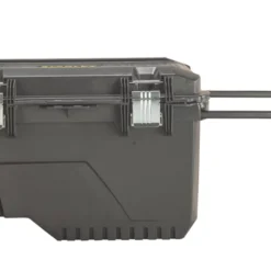 Water-resistant tool chest with metal rail inserts for loading additional equipment on top with bungee cords. Built-in stopper to hold the top-loaded equipment in place when dragging the chest. Professional metal latches with padlock eyes for added security. Removable vertical storage for hand tools. Thick rubber-coated durable 7″ wheels.