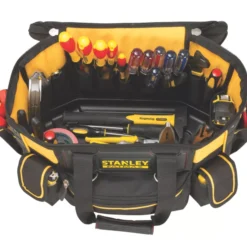 19½” (500mm). Round top tool bag design with a large storage capacity. Made of durable materials and featuring a waterproof polypropylene base. protect tools from damage and wear as well as keep them dry if the bag is left on wet ground. Padded shoulder strap and rubber grip handle make the bag comfortable to carry when loaded with tools. Durable 600 denier fabric and leather construction for longevity.