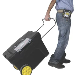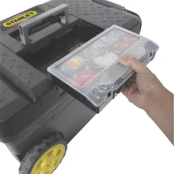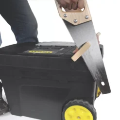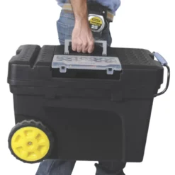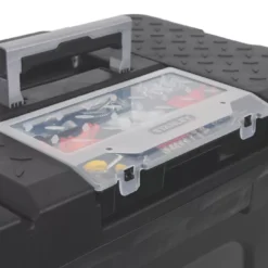 Tool chest with removable organiser for small parts and accessories. Soft-grip handle for comfort. V-groove on lid to aid the sawing of pipes and timber.
