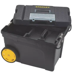 Large, waterproof tool chest with 7″ wheels and telescopic handle. Features an integral V-groove for convenient timber cutting as well as organisers for small bits and accessories. Plastic construction. 50Ltr capacity.